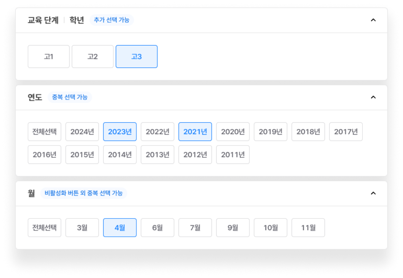 연도, 월, 배점, 문항 번호까지 검색 출제할 수 있습니다.